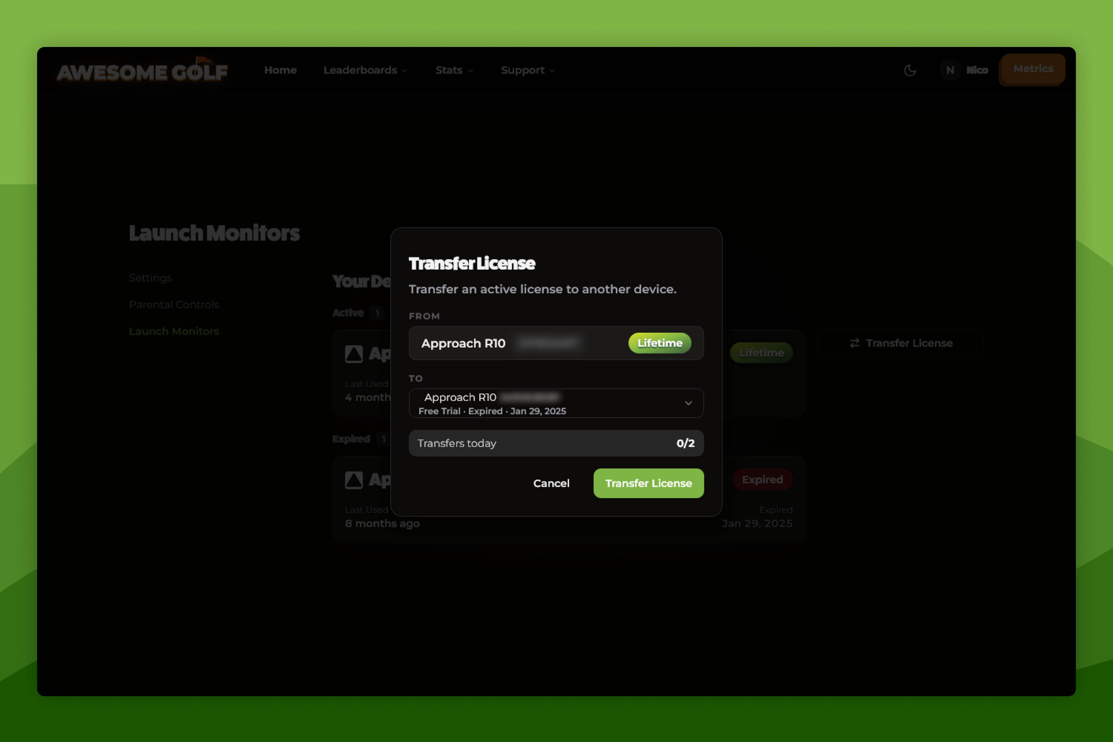 Awesome Golf Insights Launch Monitor Management Settings Page Transfer License Modal
